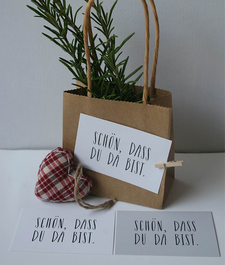 INFOS: Kärtchen mit dem Aufdruck: Schön, dass Du da bist im Visitenkartenformat in den Farben hellgrau, weiss und rosa. Gedruckt auf 300 gr matt Bilderdruckpapier.